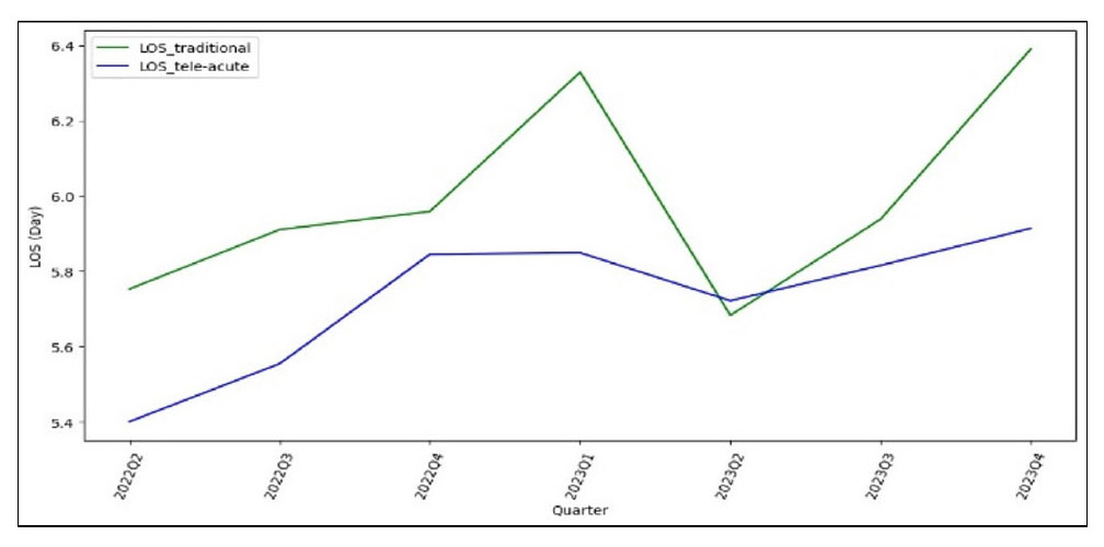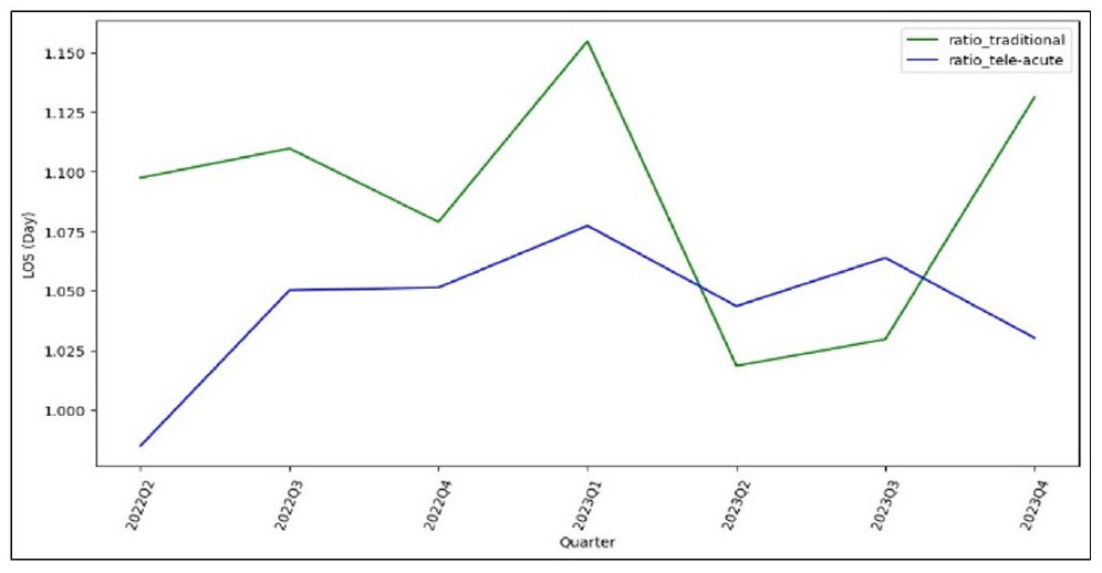 Our findings indicate that telehealth interventions in the tele-acute unit demonstrate statistically significantly impact the LOS and the ratio of actual LOS to RAE-LOS compared to the traditional unit. We observed in consecutive quarters that patients stayed shorter than projected in the tele-acute unit compared to the traditional unit. We conducted two different analyses using the LOS Model and the Ratio Model. These models were applied at the encounter level to examine the relationship between LOS and the ratio of actual to RAE-LOS across both units (tele-acute and traditional).