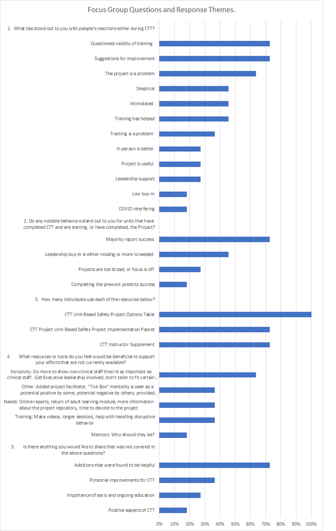 For the fifth question (Is there anything you would like to share that was not covered in the above questions?), the major themes were: positive aspects of CTT, more suggestions for improvement, and the importance of early and ongoing education about the CCT program to the entire facility.