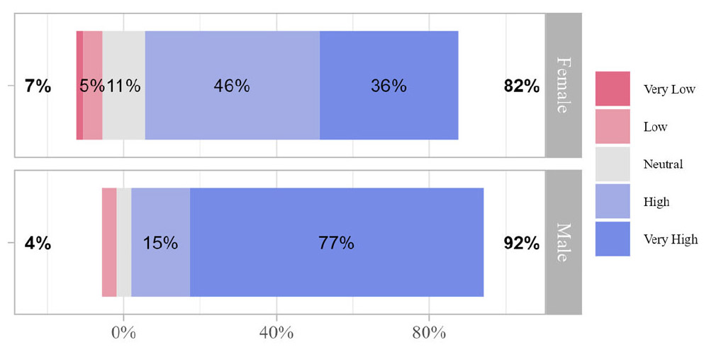 Evaluating the risk associated with blood splashes and spills, a notable contrast emerged: a higher percentage of males (77%) expressed an elevated level of concern compared to females (36%). It is worth noting however, that male participants constitute less than 10% of the total sample (